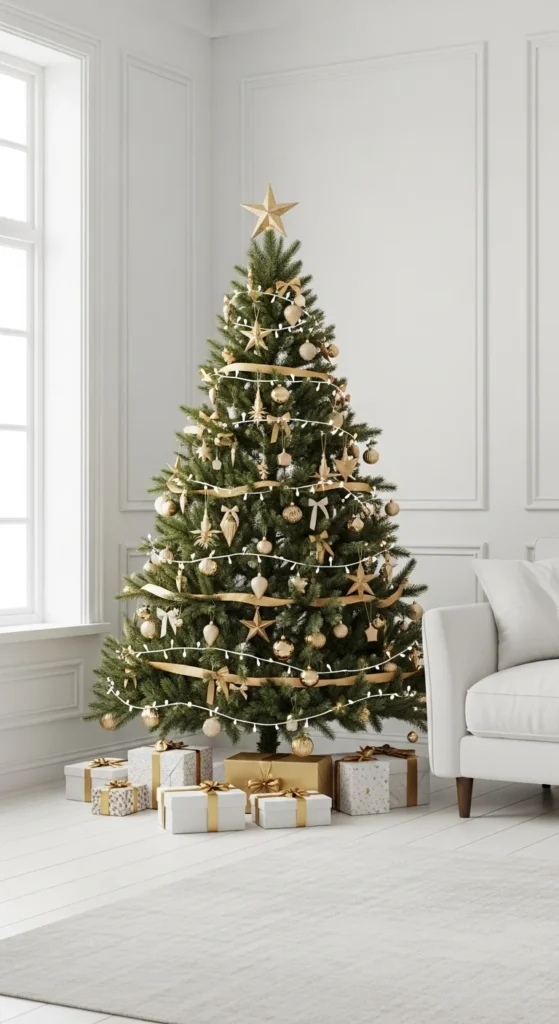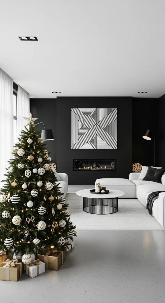 Monochrome gets festive with a touch of gold. Stick to black and white as your base, then accent with gold for contrast. Add geometric ornaments or striped ribbons for texture. This sleek, fashion-forward look feels stylish and perfect for modern design lovers.