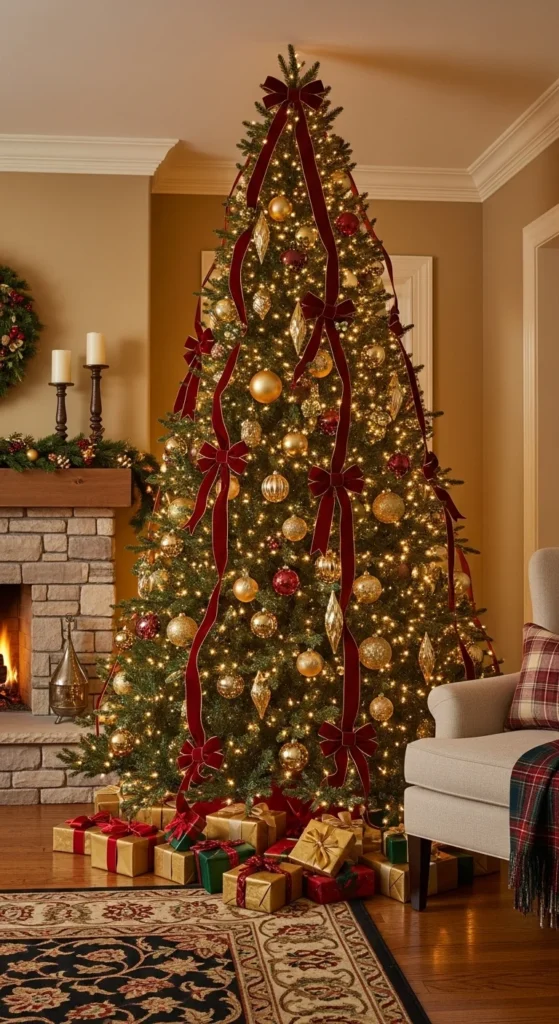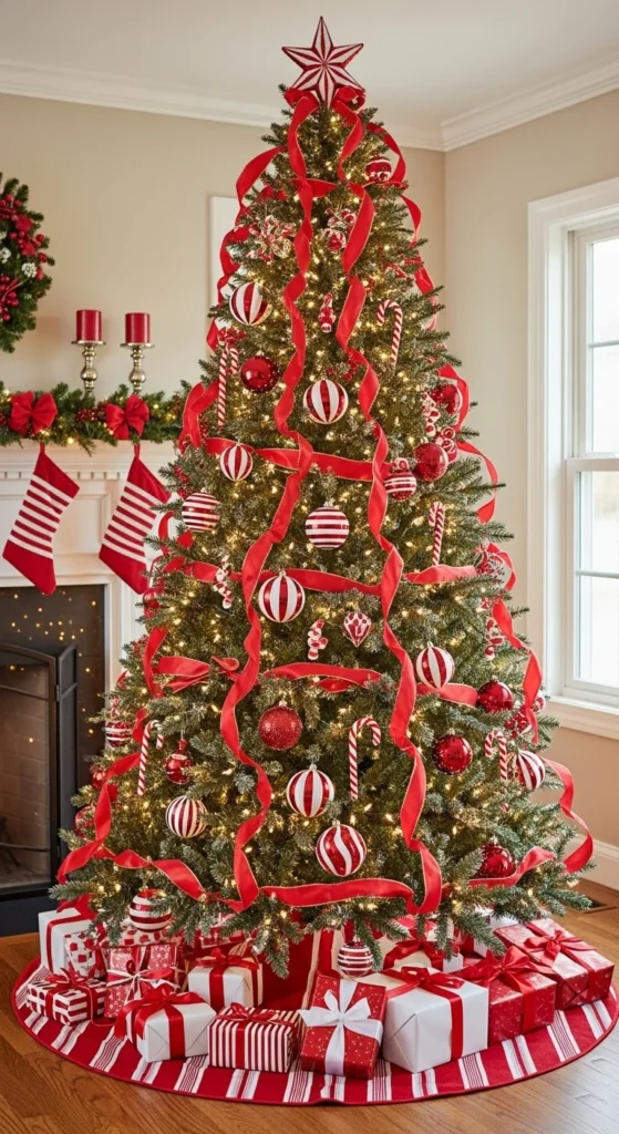 A red and white color scheme is festive and timeless. Use striped ribbons, peppermint ornaments, and snowy textures. Keep the rest of the decor simple to let the pattern pop. It’s playful yet classic — a guaranteed crowd-pleaser that works in any setting.