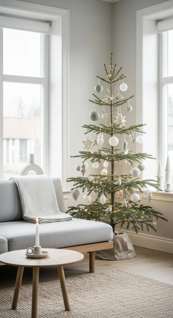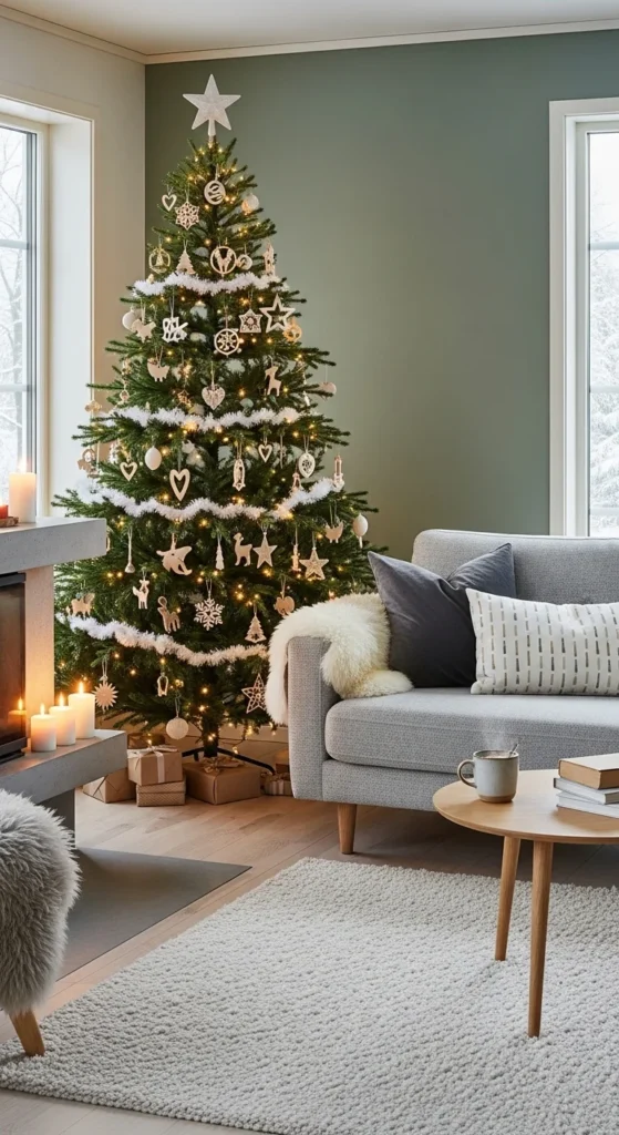 A natural, Nordic-inspired color scheme focuses on simplicity. Combine wooden tones with white accents for warmth and balance. Use paper ornaments, neutral ribbons, and soft lighting. The result feels calm, earthy, and welcoming — ideal for minimalist homes or those who love organic design.
