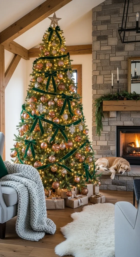 This pairing feels modern, romantic, and easy on the eyes. The soft shimmer of rose gold brings warmth, while grey tones ground the look. Add matte ornaments, silky ribbons, and glass accents for balance. It’s a chic palette for anyone who prefers muted elegance over bright holiday colors — stylish, calm, and graceful.