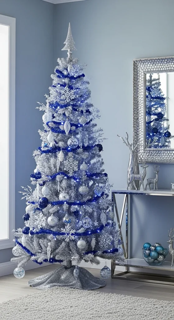 For a wintery, elegant vibe, go for silver and icy blue. This combo feels cool, crisp, and serene — perfect for modern interiors. Use silver baubles, glass ornaments, and soft blue ribbons. Add white fairy lights for shimmer. You can even include mirrored accents to reflect light and make the room feel spacious and fresh.