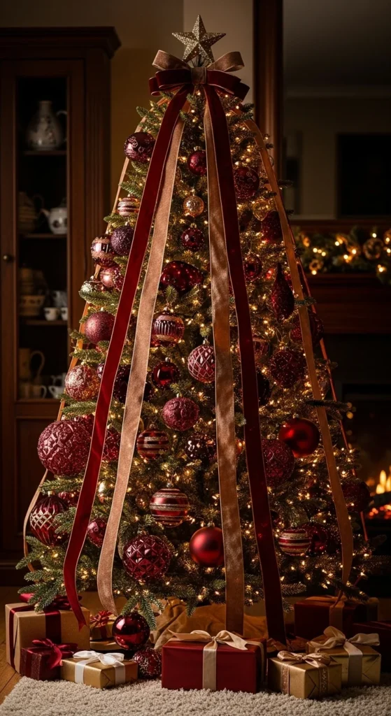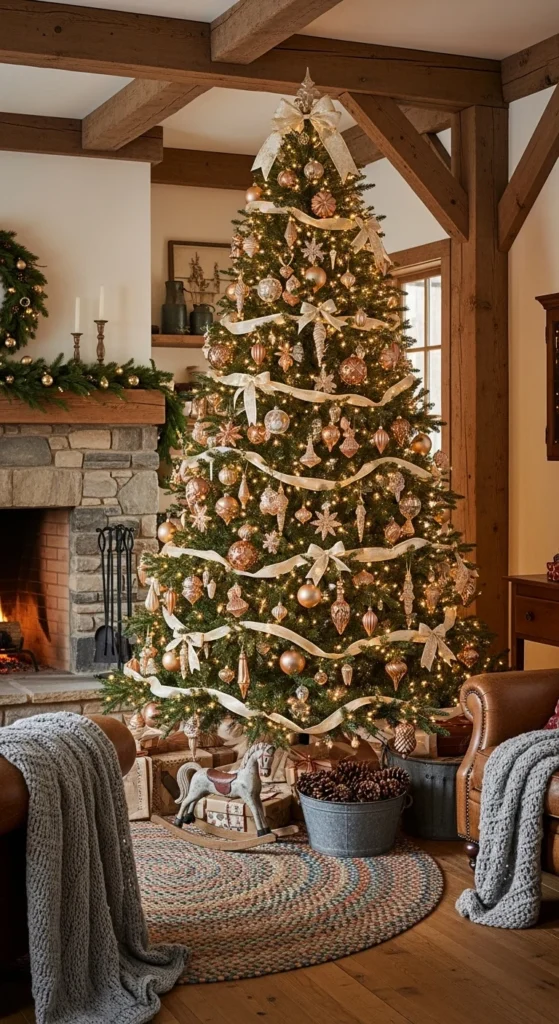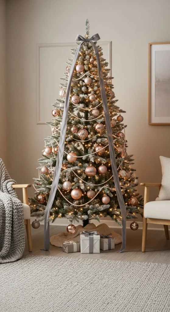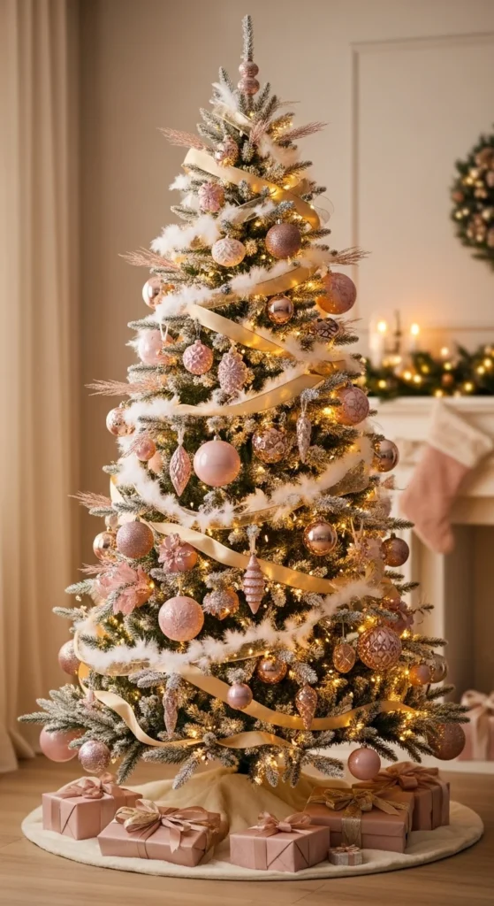 Blush tones mixed with champagne gold feel soft, elegant, and sophisticated. This palette works beautifully with white or cream backgrounds. Use velvet or satin textures for ornaments and wrap gifts in matching tones. Add fairy lights for warmth. It’s feminine without being over-the-top — ideal for chic, stylish spaces.