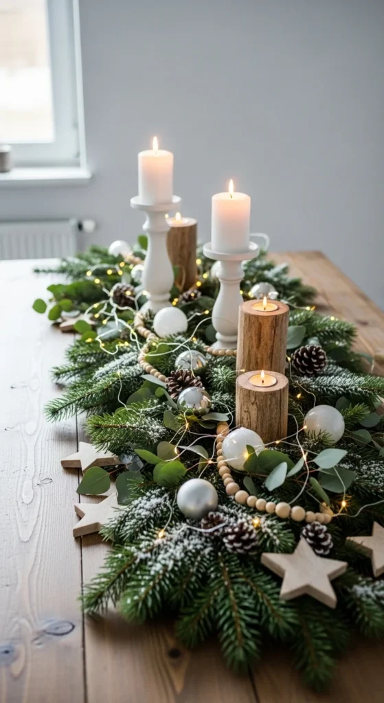A botanical approach feels peaceful and timeless. Combine green foliage with white and wood tones for a natural yet polished holiday look. Eucalyptus, pine, and soft linen textures make it fresh and organic. Add simple ceramic ornaments and soft fairy lights. This color scheme invites serenity and looks beautiful in both rustic and modern homes.