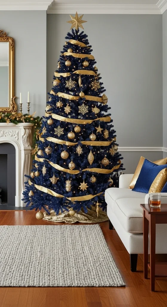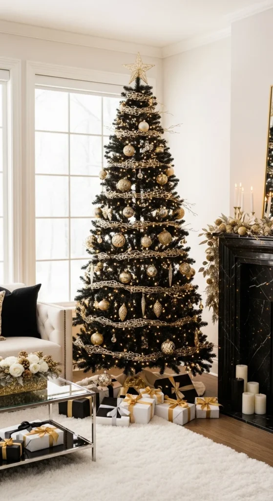 Make a bold statement with black and gold. The dark base gives depth, while gold accents bring shimmer. Use matte black ornaments with shiny gold touches for contrast. Add white candles or fairy lights to keep it glowing. This look is perfect for those who love luxury and drama with a modern edge.