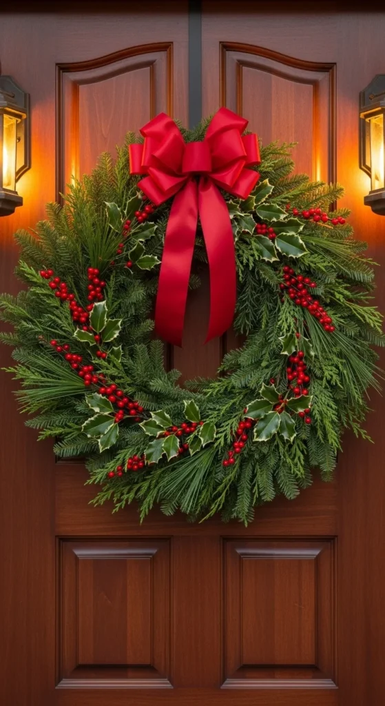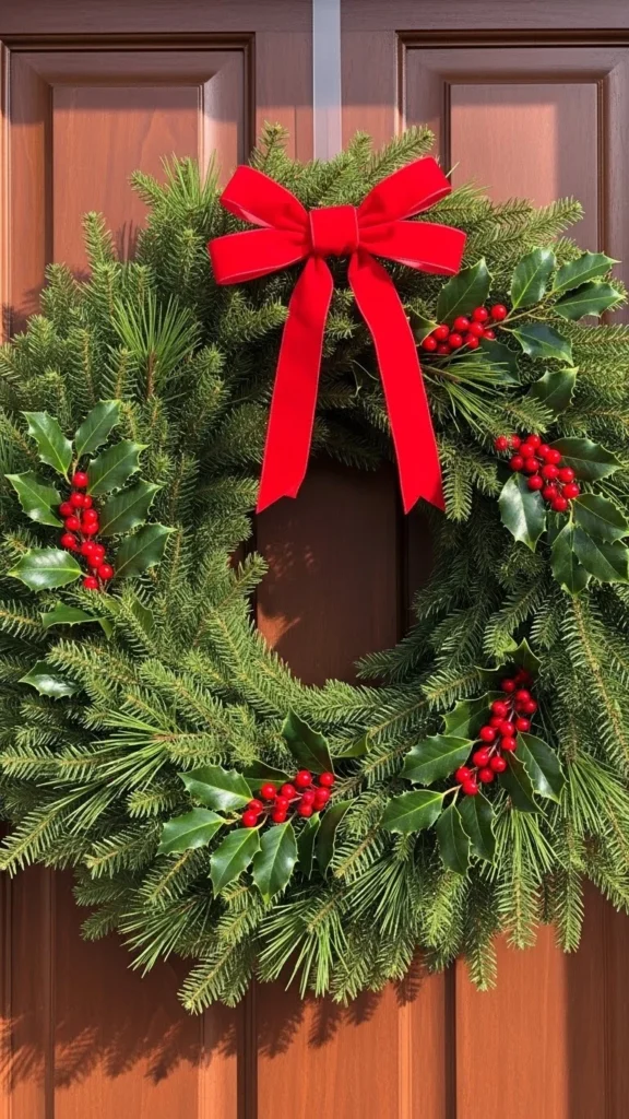 A red bow evergreen wreath offers timeless charm. The bow pops against lush greenery and instantly sets a warm mood. Holly sprigs add recognizable holiday detail without clutter. This is one of the easiest wreaths to refresh each year — just replace the bow with a crisp new one. Choose a wide ribbon with wire edges so you can fluff it to perfection. This wreath looks especially lovely on natural wood doors since the tones complement each other. Keep porch décor simple to maintain that classic look.