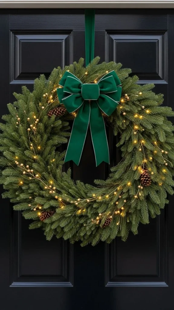 A velvet bow instantly adds luxury to your wreath. Its rich texture contrasts beautifully with evergreen branches. Choose a wide ribbon so the bow feels substantial. Gold accents offer gentle sparkle, while fairy lights add a magical touch at night. This wreath works well with darker doors since the velvet stands out clearly. Velvet ribbon is easy to shape when it has wired edges, making the bow sit neatly throughout the season. Keep additional ornaments minimal so the bow remains the star. The look feels polished and festive without being overdone.