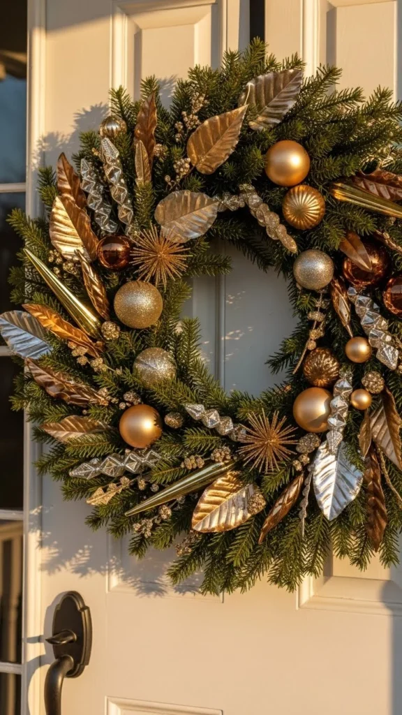 Mixed metals create a stylish, layered look. Gold adds warmth, silver brings brightness, and bronze adds grounding. Together they form a wreath that feels rich without leaning too bold. Pairing metallics with evergreen prevents the design from feeling too shiny. Choose ornaments in various shapes and sizes for visual interest. This wreath works well for homes that use neutral palettes or transitional architecture. You can DIY using leftover ornaments in mismatched colors — spray painting them metallic creates a coordinated finish. It’s a great way to reuse items while creating an eye-catching doorway accent.
