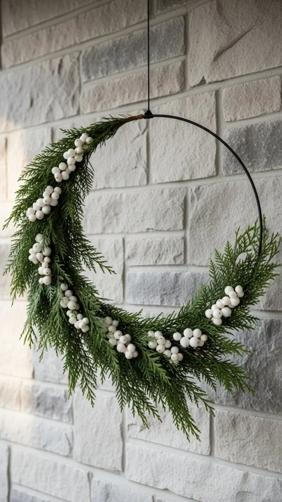 A white berry wreath gives you a clean, modern appearance. The contrast between bright white berries and rich green cedar creates a striking shape. Using a thin hoop instead of a full greenery base keeps the design airy. This wreath works well for contemporary homes or those with stone or brick entries. Cedar branches are easy to attach using floral wire. For extra texture, mix long and short stems so the wreath feels intentional rather than overly symmetrical. The design feels crisp, calm, and inviting.