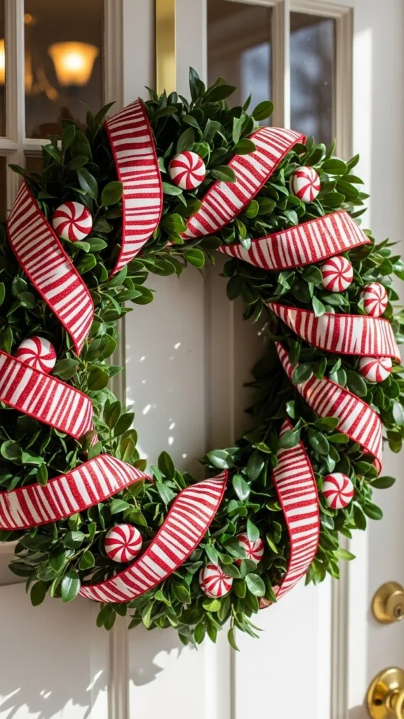 Candy cane stripes bring instant holiday charm. Wrapping your wreath with striped ribbon keeps the design cheerful without feeling busy. Peppermint ornaments add fun detail, especially for families who enjoy whimsical décor. For a budget option, use ribbon from craft stores and reuse the ornaments year after year. The bright palette suits white doors especially well. Keep nearby décor cohesive with a few matching accents — perhaps a striped doormat or red lantern. It’s a cheerful way to welcome guests.