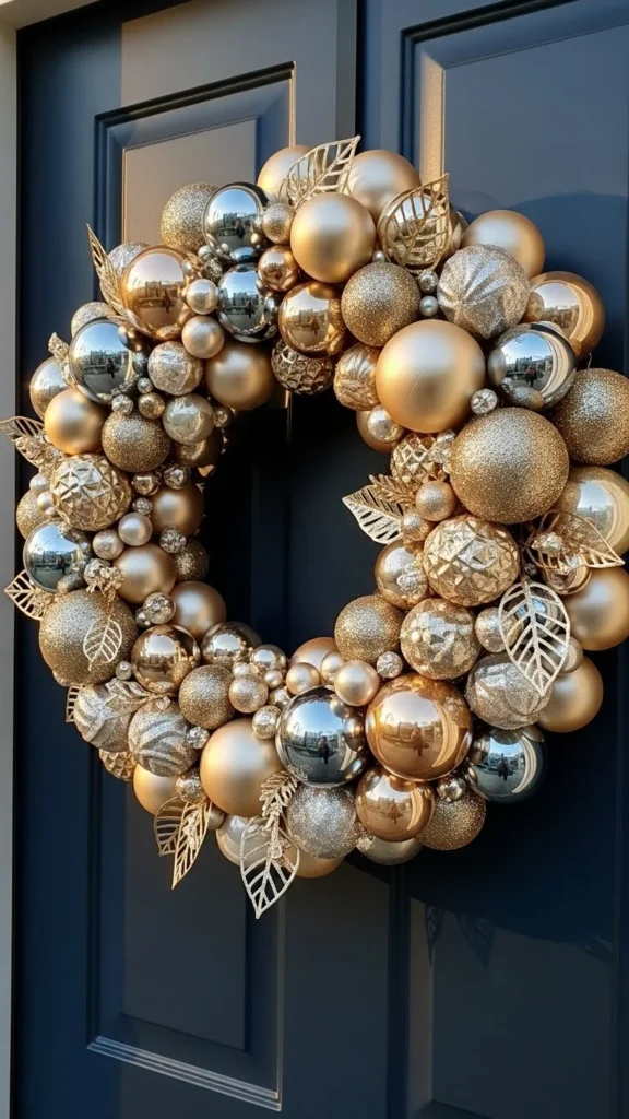 A champagne ornament wreath offers a soft glam style with a gentle shimmer. It’s ideal for doors that can handle a bit of shine without clashing. Choose ornaments in matte, glossy, and pearlescent finishes for dimension. Metallic leaves soften the design and make it feel coordinated. Assemble it using a foam base and hot glue, which makes it simple to customize. This wreath pairs beautifully with neutral porch décor and warm lights. It has a polished charm that feels welcoming and stylish.