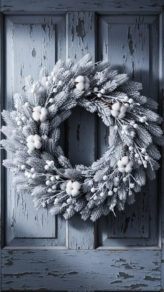 A pinecone-and-feather wreath offers a soft, dreamy style. Painting the pinecones white creates gentle contrast, while feathers add delicate movement. Frosted leaves reinforce the winter theme without relying on heavy greenery. This wreath suits neutral homes or minimalist entries. It’s also a comfortable DIY project since most components are lightweight. Use a beige or cream ribbon to keep the palette calm. The look feels serene and pairs wonderfully with subtle porch lighting.