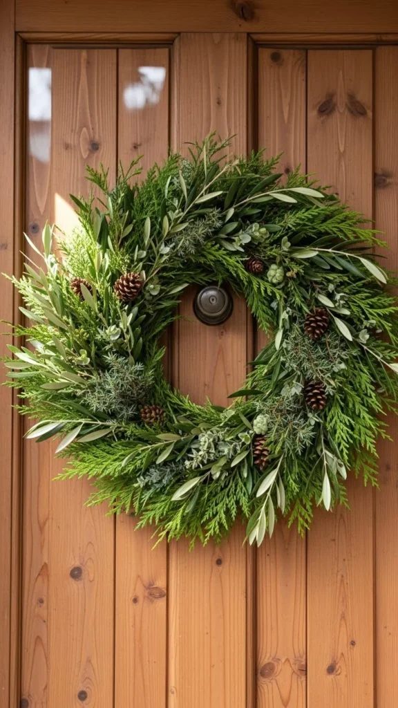 A wild greenery wreath offers a refreshing, natural look. Mixing various branches gives the wreath movement and shapes that feel organic. Olive leaves add softness, while juniper berries bring tiny pops of contrast. This wreath is easy to DIY if you have access to fresh clippings. Tie stems with floral wire to keep them secure. It’s perfect for those who enjoy understated décor with earthy charm. Pair it with a simple doormat or lantern to keep the look cohesive.
