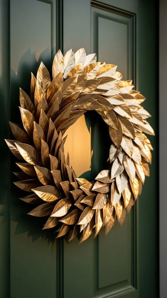 A laurel-style wreath brings a regal touch to your front entry, especially during the holidays when gold tones feel extra festive. The metallic leaves catch light beautifully, making the door glow at different times of day. This wreath works especially well if your home leans classic, mid-century, or contemporary. You can DIY a similar look using gold spray paint on faux laurel stems, which keeps costs low while still offering a polished finish. Attach the stems to a foam or wire base, overlapping them tightly so the circle reads clean and full. Pair this wreath with simple accessories — maybe a muted doormat or a pair of lanterns — so the shine becomes the focus. The piece welcomes guests with subtle sophistication and adds a graceful holiday flair without relying on traditional greenery.