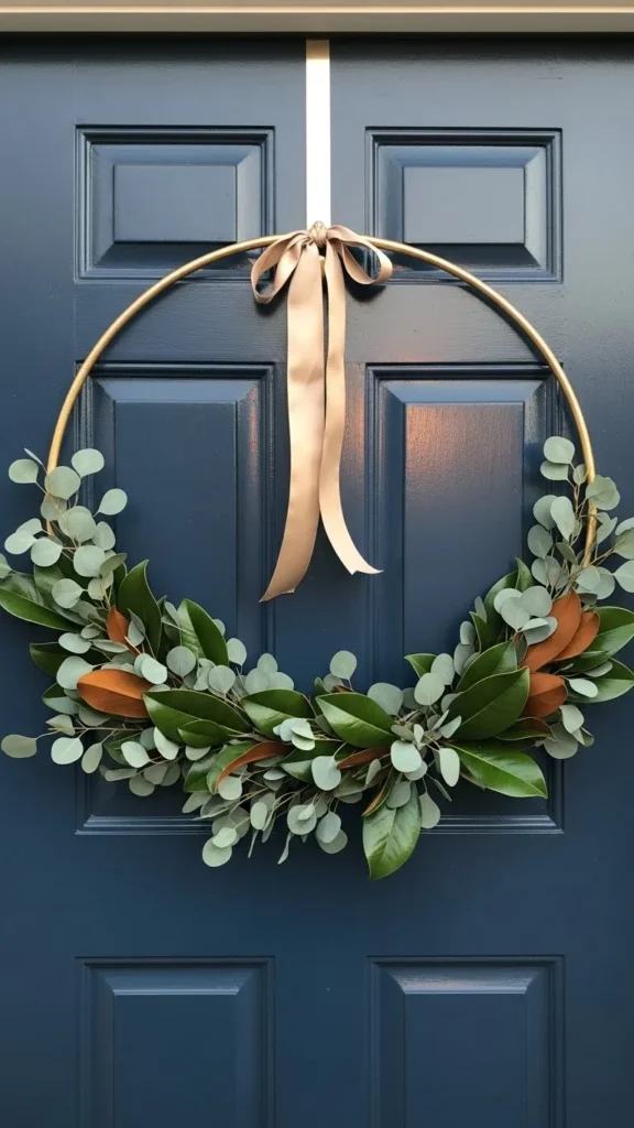 A gold hoop wreath brings a modern, airy look to your doorway. The open frame allows the color of your door to show through, giving you a clean, simple profile. Eucalyptus adds a fresh texture, while magnolia leaves introduce warmth with their glossy finish. Keep the greenery off-center for a stylish asymmetrical look. This type of wreath is easy to DIY since you only attach a small cluster of stems. Try faux stems if you want long-lasting results for the whole season. A silk ribbon in champagne or taupe completes the design without overwhelming the shape. This wreath fits well with homes that feature bold door colors or sleek architecture. It offers quiet elegance with minimal effort.