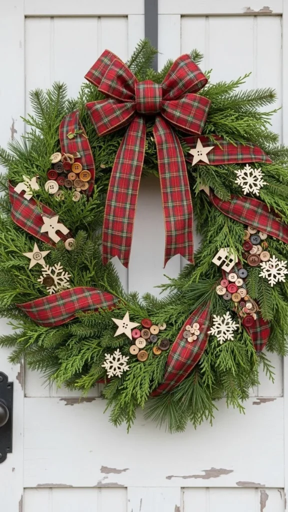 Plaid ribbon brings a cozy country feel to your entrance. The pattern is warm, nostalgic, and instantly festive. Wrap the ribbon around the wreath loosely to avoid tightening the greenery. Add wooden ornaments or simple shapes if you want charming detail without going overboard. The look fits cottage-style homes beautifully, especially when paired with vintage lanterns or woven baskets near the entry. If your ribbon has wire edges, shaping it becomes easier and keeps the loops tidy in windy weather. This is a budget-friendly option too — you can refresh last year’s wreath by simply switching the ribbon. The result feels cheerful and homey, perfect for anyone who loves classic Christmas patterns.