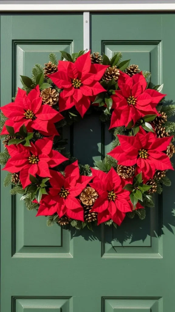 A poinsettia wreath makes a strong impression thanks to its bold color and dramatic petals. Choose large blooms to give your wreath presence, especially if your door is wide or tall. The gold-tipped pinecones add a festive shimmer without competing with the flowers. Faux poinsettias are ideal outdoors because real petals struggle in the cold. This wreath looks great with minimal supporting décor since the flowers already make a confident statement. Consider adding a thin ribbon if you want a soft accent, but keep it tucked toward the top. The display feels warm, cheerful, and instantly seasonal.