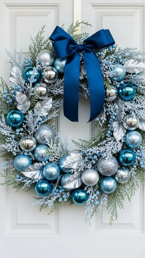 A blue wreath stands out beautifully, especially if you want something beyond traditional reds and greens. The mix of icy blue and silver creates a cool winter glow that looks clean and stylish. Choose ornaments in different finishes so the light reflects at various angles. Frosted cedar keeps the wreath from feeling too metallic. This piece works especially well against white or dark doors. A navy satin ribbon grounds the design and adds softness. You can assemble it using inexpensive ornaments from discount bins, giving you a bold display without high costs.