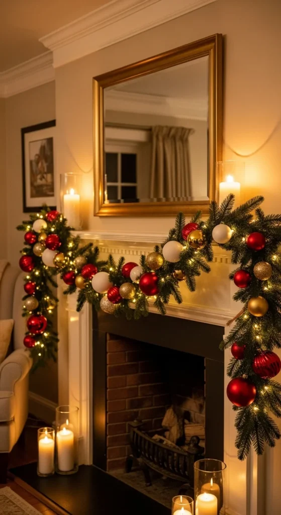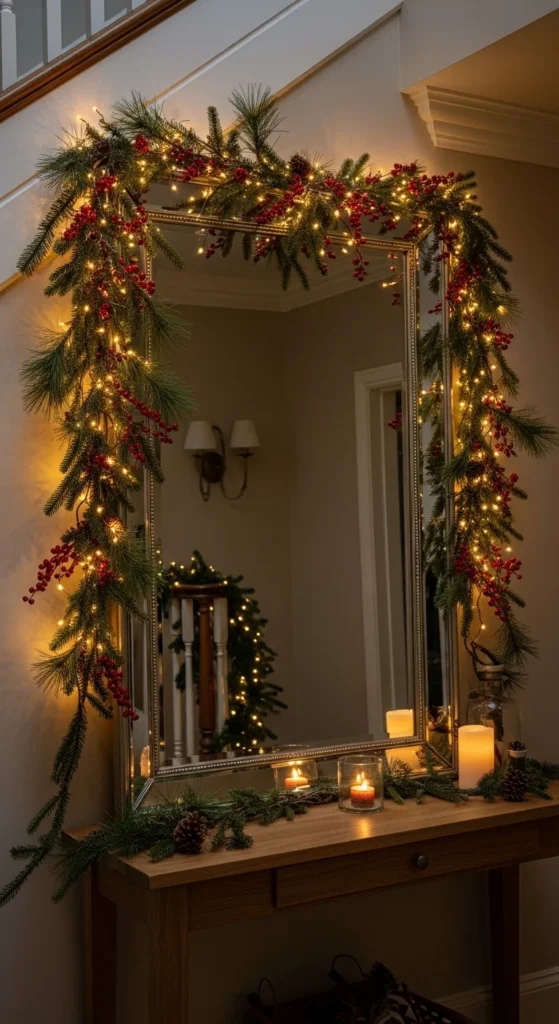 Turn your entryway mirror into a statement piece. Frame it with green garland and string lights for instant holiday charm. Add red berries or ornaments for a touch of color. It’s a quick DIY project that feels upscale but costs under $20 to recreate.