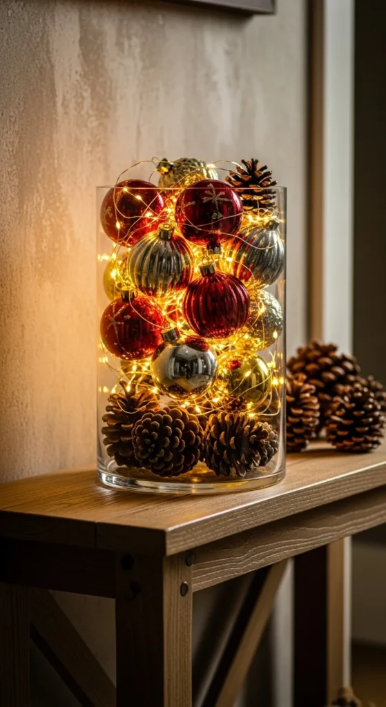 Transform plain glassware into decor. Fill clear vases, jars, or bowls with ornaments, fairy lights, or even cinnamon sticks. Use different heights and shapes to create interest. It’s quick, inexpensive, and can be repurposed for every season — a must-have trick for budget decorators.