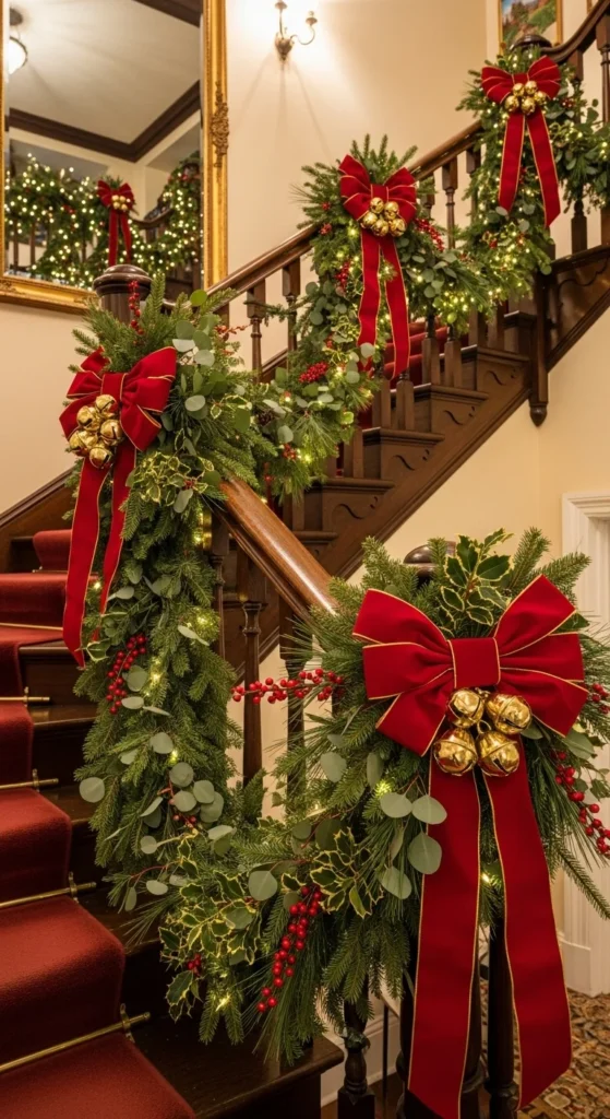 Dress your staircase without overspending. Drape basic green garland and weave in ribbon for luxury texture. Add bells or leftover ornaments for sparkle. This layered look feels designer-approved and costs very little. Stick to one or two ribbon colors for a cohesive, polished finish.