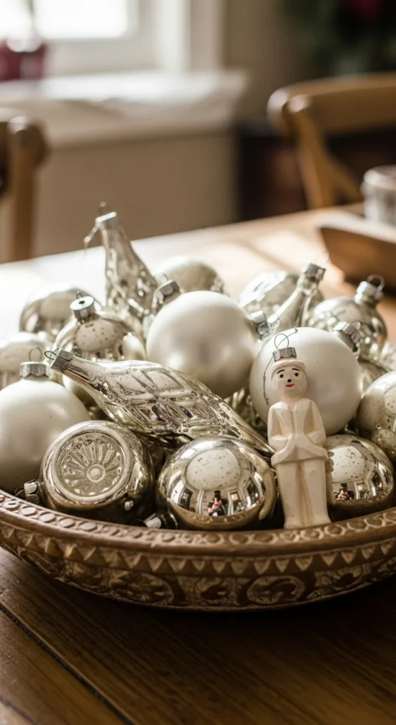 Giving secondhand finds a new life. Collect old or thrifted ornaments and spray-paint them in cohesive colors like gold, ivory, or silver. Mix finishes — matte, gloss, and glitter — for variety. Display them in bowls or hang them for a uniform, curated look that feels straight out of a designer catalog.