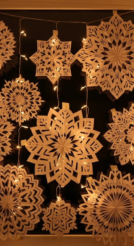 Paper snowflakes never go out of style. Cut them from white cardstock or recycled paper, then tape them to your windows. Add string lights behind them for sparkle. It’s free, fun to make, and looks magical at night. A perfect winter project for kids or adults.