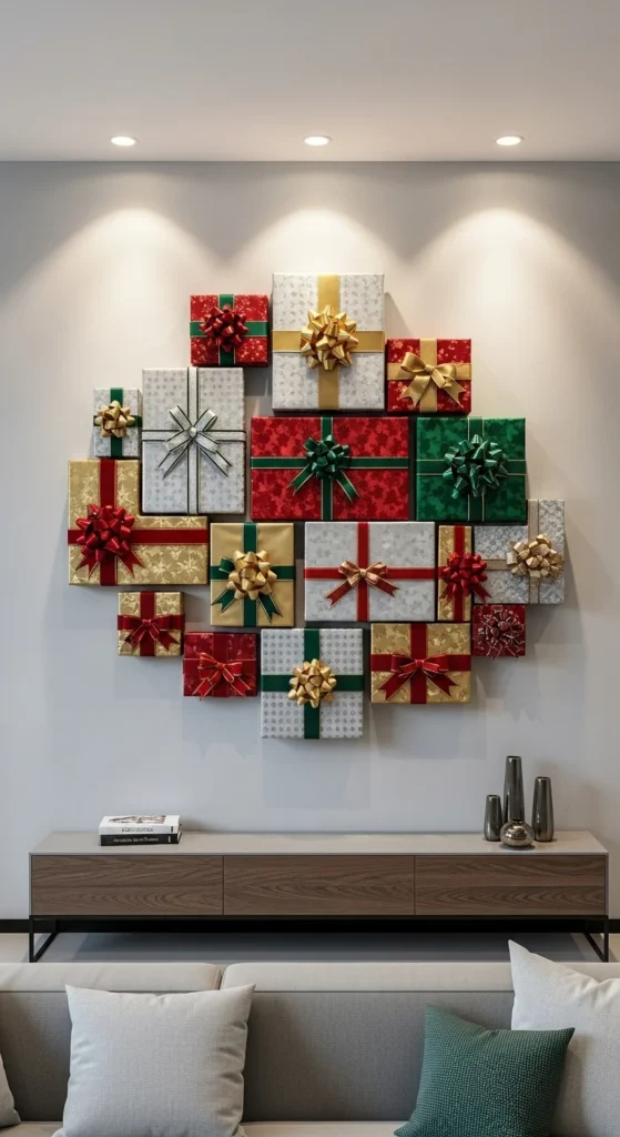 Turn leftover wrapping paper into decor. Wrap small cardboard boxes and hang them on your wall as “gift art.” Use different sizes for variety and tie each with ribbon. It’s playful, affordable, and looks custom-made. Perfect for filling blank walls during the holiday season.