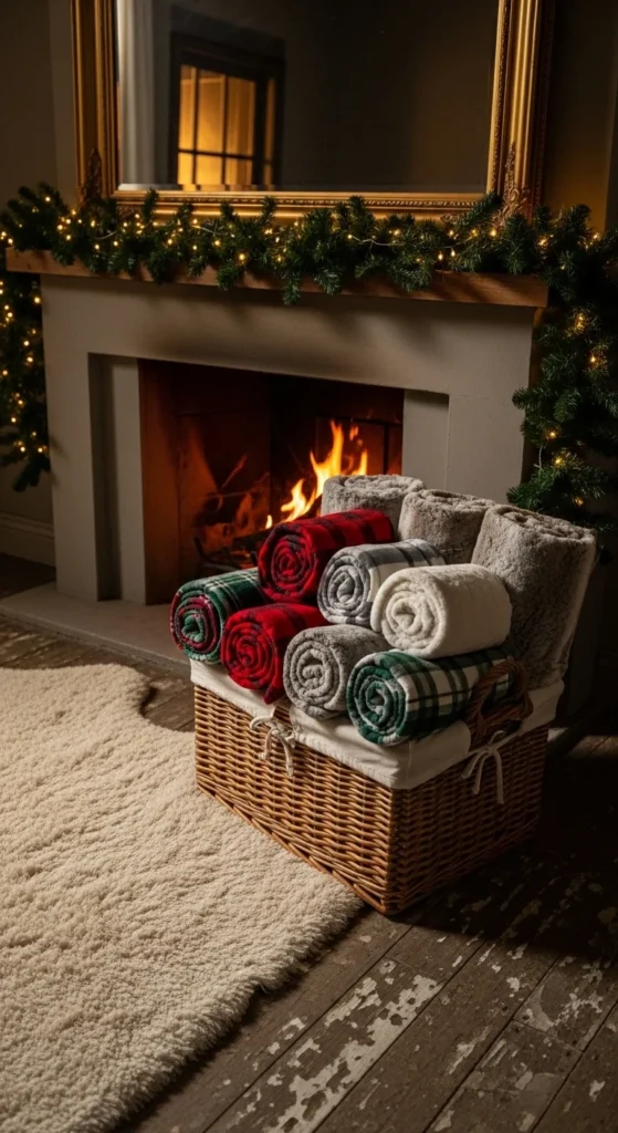 Use what you already own. Place throw blankets and pillows in a decorative basket beside the fireplace or sofa. Choose cozy textures like plaid, fleece, and fur. This adds warmth, comfort, and style without buying anything new. It’s practical yet decor-perfect.