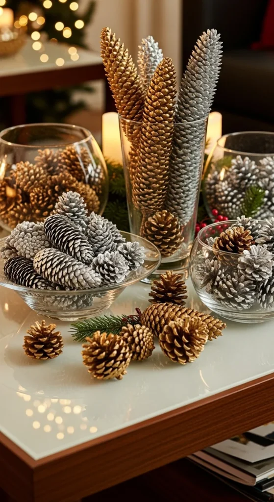 Turn nature into decor with a simple DIY trick. Collect pinecones and spray-paint them gold, silver, or rose gold for an upscale feel. Place them in glass bowls, vases, or trays for a centerpiece that looks boutique-worthy. Add a few sprigs of greenery for balance. This easy project costs next to nothing but looks elegant enough for any high-end home.