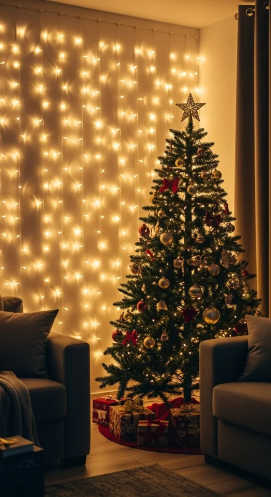 Turn any wall into a showstopper with curtain string lights. Hang them vertically for a glowing backdrop. It’s perfect behind a tree, sofa, or even in a bedroom. The light makes the room feel cozy and luxurious, yet the setup takes under ten minutes and costs less than dinner out.