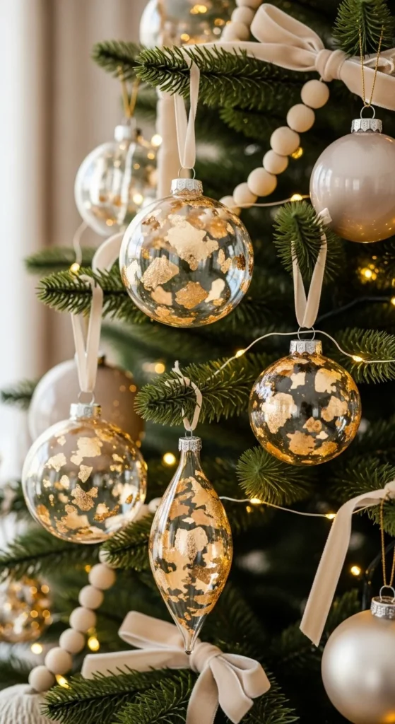 Transform basic clear ornaments into something glamorous. Apply gold leaf sheets to the inside or outside of each ball using adhesive. The irregular texture gives an expensive, handcrafted finish. Hang them on your tree or place in a bowl as table decor. This trick adds a hint of glam without spending on designer ornaments.
