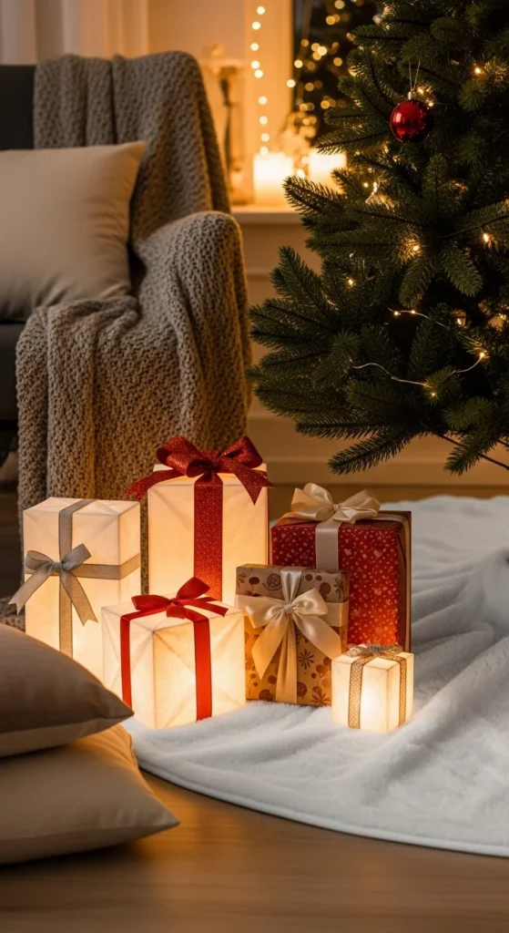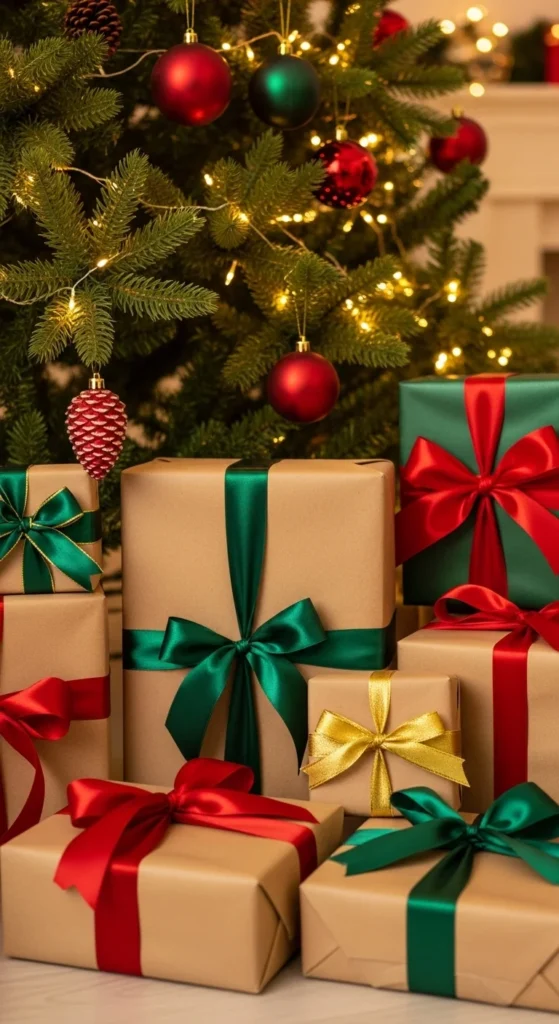 Even the presents can become part of your decor. Use neutral or kraft wrapping paper and add elegant ribbons or sprigs of pine for texture. Stack a few wrapped boxes strategically near your tree or fireplace. The cohesive color scheme gives a polished, magazine-like look — without spending much beyond wrapping supplies.
