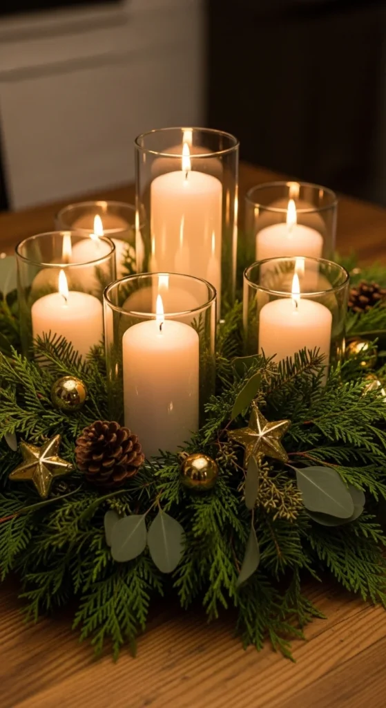You don’t need a designer centerpiece to impress guests. Group candles of different heights on a tray or mirror, then add pinecones, ornaments, and garland around them. It’s affordable, easy to assemble, and gives a glowing, romantic effect. Use LED candles for safety and a long-lasting glow.