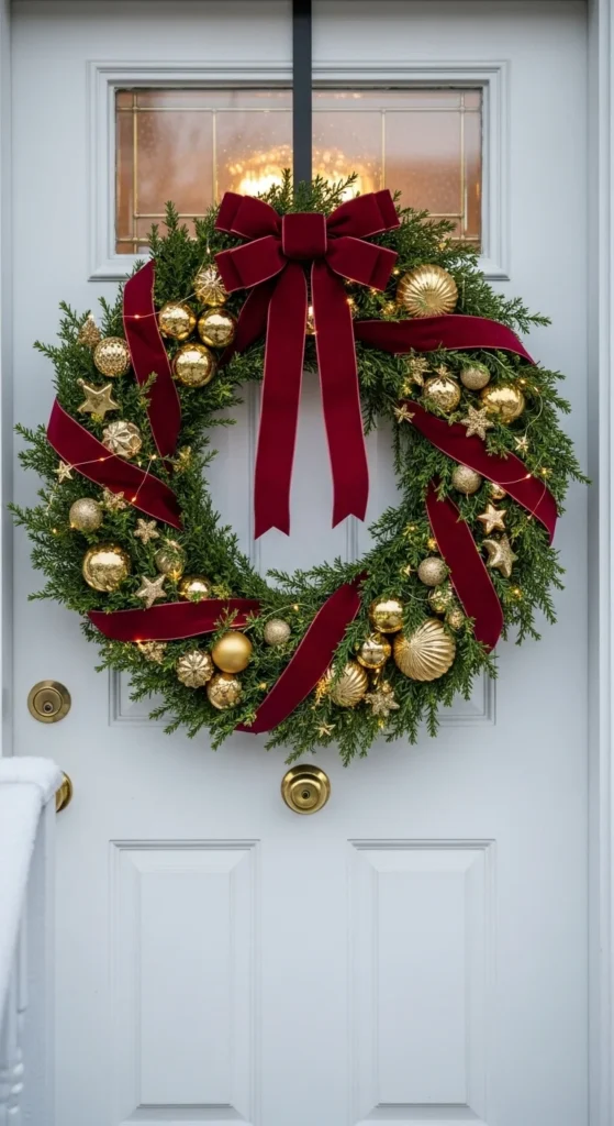 Start with a basic store-bought wreath and give it a custom upgrade. Add ornaments, ribbon, or small floral picks to match your decor theme. Spray a little faux snow for texture. Hang it with a wide ribbon instead of a metal hook for a polished, boutique-worthy finish.