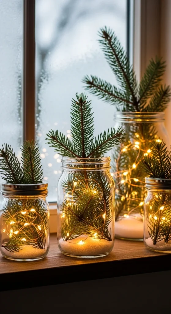 Turn mason jars into glowing lanterns using simple materials — fairy lights, pine, and artificial snow. Place them on windowsills, mantels, or dining tables. Add ribbons or twine for detail. These jars cast a soft glow and look professionally styled, yet cost less than a few dollars each.