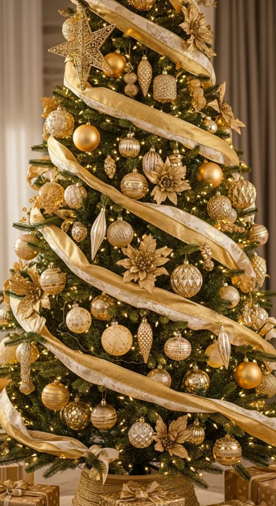 Skip dozens of pricey ornaments and use ribbon as your main decor. Drape wide satin or wired ribbon down your tree in soft waves. It fills space beautifully and adds an elegant designer touch. Choose metallics or neutrals for a cohesive, high-end look that feels intentional and refined.