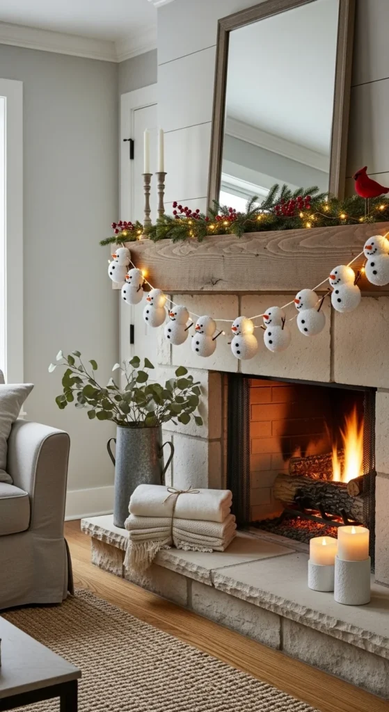 A pom-pom snowman garland is simple enough for kids and charming enough for adults. Make three pom-poms per snowman: small, medium, large. Glue them together, add tiny felt hats, and draw faces with a marker. String them on twine for a soft handmade look. Hang the garland across a mantel, doorway, or window. Keep the color palette clean with white, black, and small red accents. Use scrap felt to avoid extra spending. This craft is lightweight, safe, and fun to build as a group activity. You can even let each child decorate a snowman differently to add personality. It brings a gentle winter feel without requiring much time.