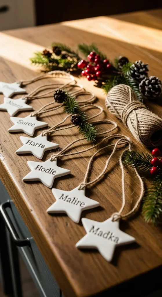 Clay gift tags elevate your wrapping with handmade charm. Roll out air-dry clay, cut star shapes, and use stamps to press names or words. Let them dry overnight. Kids enjoy pressing textures while adults help with shaping. Attach them to wrapped gifts or hang them on small branches. Their simple matte finish gives a calm Scandinavian feel. They also work well as place cards for holiday meals. Air-dry clay is inexpensive and easy to use.