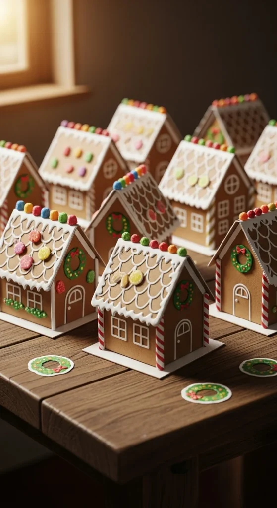 These houses are mess-free alternatives to edible ones. Cut simple house shapes from cardboard and glue them together. Kids paint white icing lines, windows, and doors. Add stickers or tiny wreaths for character. Display them on mantels or shelves. Use recycled boxes to save money. Because they’re lightweight, you can create entire villages. It’s a great craft for groups because each house can look completely unique.