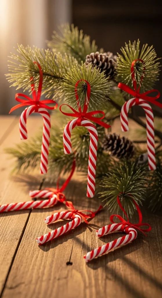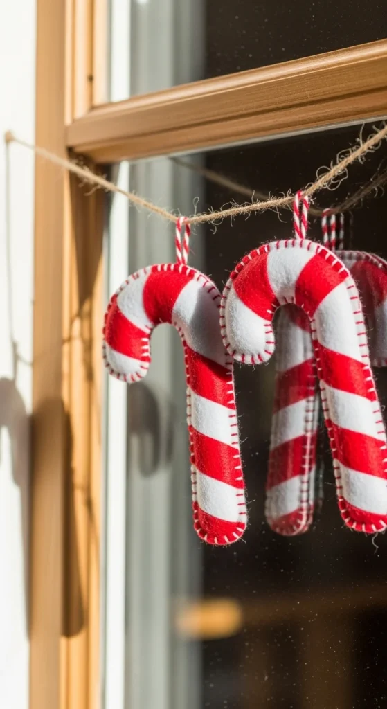 Felt candy canes create a soft holiday moment. Cut candy cane shapes from red and white felt, then stitch or glue them together. Kids can help with the shapes and adults can handle the stitching. Hang them on twine for a light garland. Felt is affordable and easy to cut, making this project great for beginners. Pair it with simple greenery to keep the look calm.