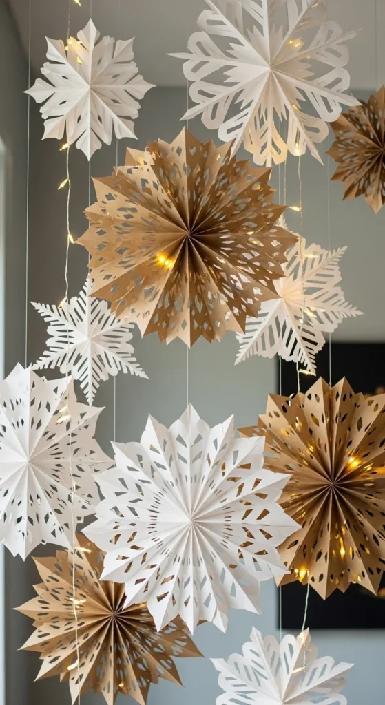 Paper bag snowflakes make a dramatic impact with very little cost. Glue seven identical bags together, cut patterns along the edges, and open them into a full snowflake. Kids love revealing the final shape. Hang them in clusters for a magical effect. Use white or kraft bags depending on your style. These snowflakes fold flat for storage. They work beautifully for parties or entryways.
