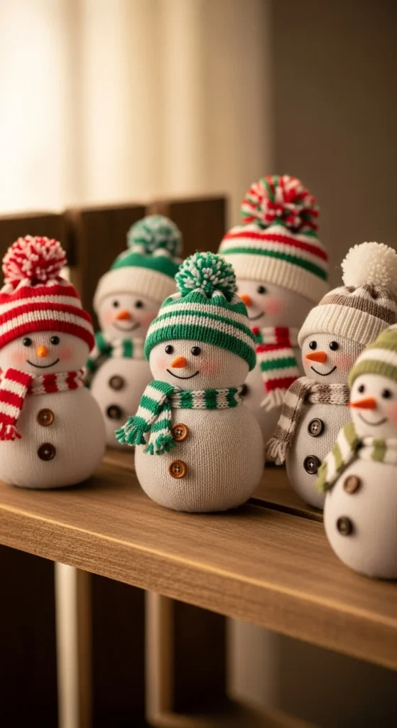 Sock snowmen are fun, soft, and quick to make. Fill a plain sock with rice, tie off sections for the body, and add simple decorations. Kids can choose buttons and hat colors. Adults can manage the tying and gluing. These snowmen sit nicely on shelves or mantels. Use old socks to save money. They become adorable little characters that everyone enjoys.