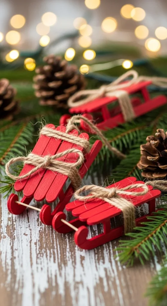 Popsicle stick sleds have a charming handmade feel. Glue sticks into sled shapes, paint them, and add twine for hanging. Kids can paint while adults help with assembly. These ornaments look adorable on trees or gift packages. Use inexpensive craft paint and leftover twine for a budget-friendly project. You can keep them plain or add tiny names and dates.