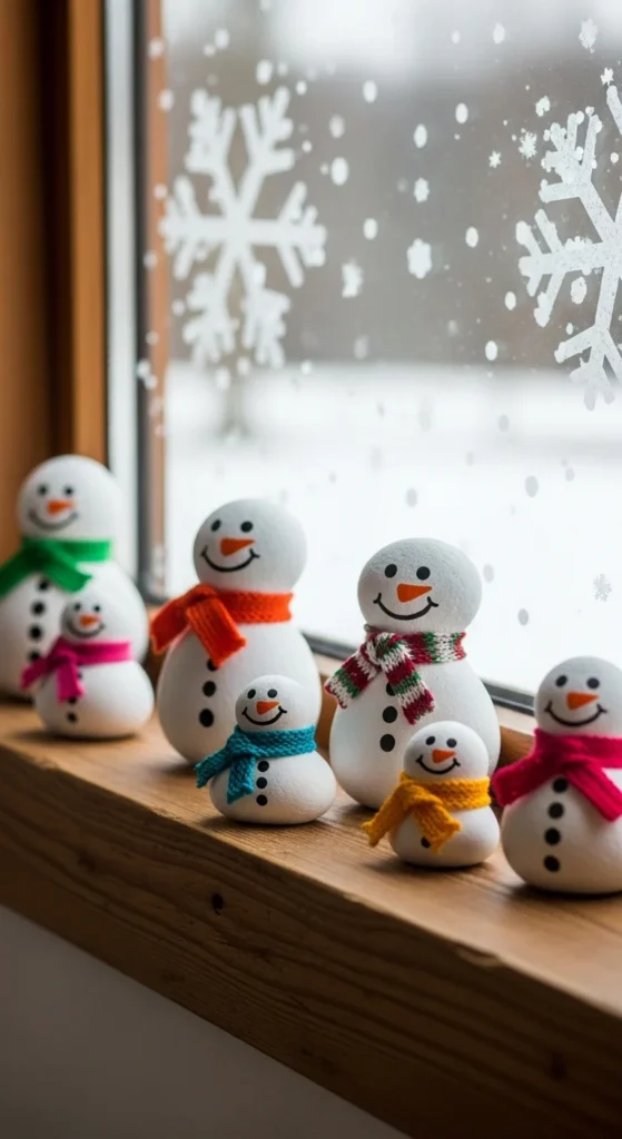 Rock snowmen are simple but full of character. Gather smooth rocks, paint them white, and add faces with a marker or paint. Tie a bit of yarn or ribbon around as a scarf. Kids enjoy picking rocks and adding expressions. These snowmen sit well on desks, shelves, or window ledges. Rocks are free, so this craft works well for big groups. Paint them with matte colors for a soft finish.
