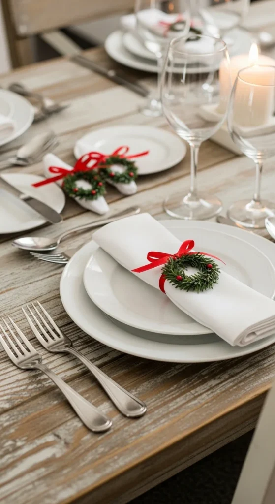Mini wreath napkin rings make your table feel welcoming. Form small circles from faux pine stems and secure with floral wire. Add a tiny ribbon for color. Kids can help with shaping the pine while adults handle the wire. These rings look lovely with simple table settings. You can reuse them each year. Pair them with linen napkins for a soft, calm holiday feel.