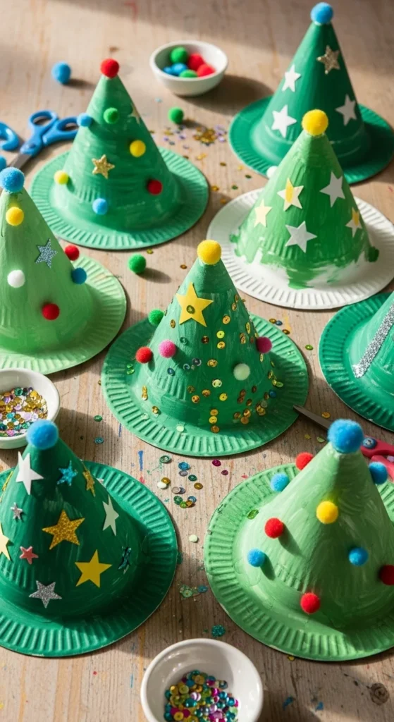 Paper plate trees are perfect for quick afternoon crafting. Fold a plate into a cone, paint it green, and add decorations with glue. Kids love picking their own ornaments, while adults can help shape the cones for stability. Add paper stars or glitter glue for a small sparkle. These trees make adorable shelf fillers. Keep extras for a kids’ craft corner. This idea works well for classrooms or parties because the materials are cheap and easy to clean up. Encourage everyone to mix styles so the collection feels lively and personal.