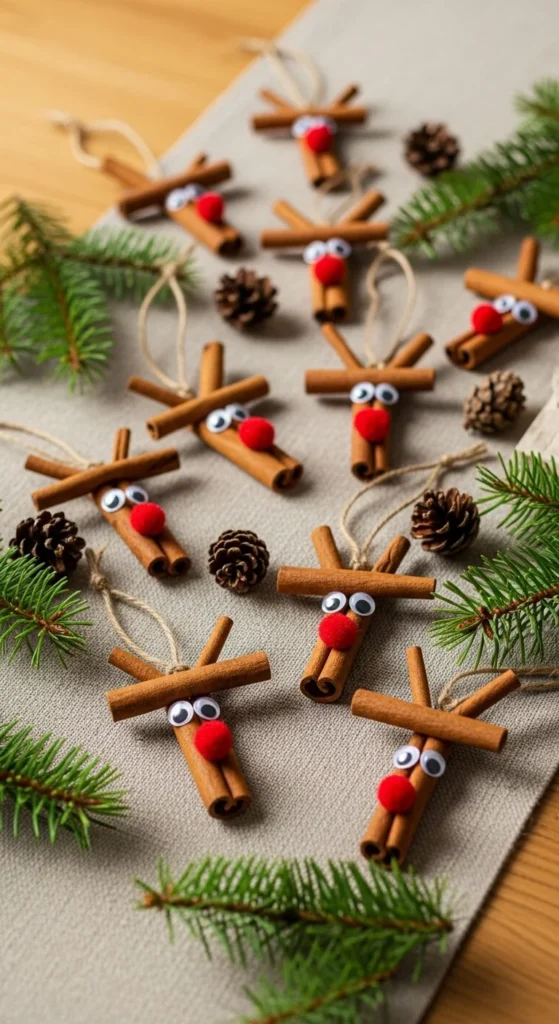 Cinnamon stick reindeer smell amazing and look cute on any tree. Glue three sticks into a simple triangle, add eyes, and a bright nose. Kids can tie the twine hangers while adults add the glue. These decorations dry quickly and bring charm to simple branches or garlands. Use small felt scraps for ears if you want extra detail. A little hot glue goes a long way. They are perfect for gifting because they are light and easy to package. The natural cinnamon scent adds a warm holiday mood to any room.