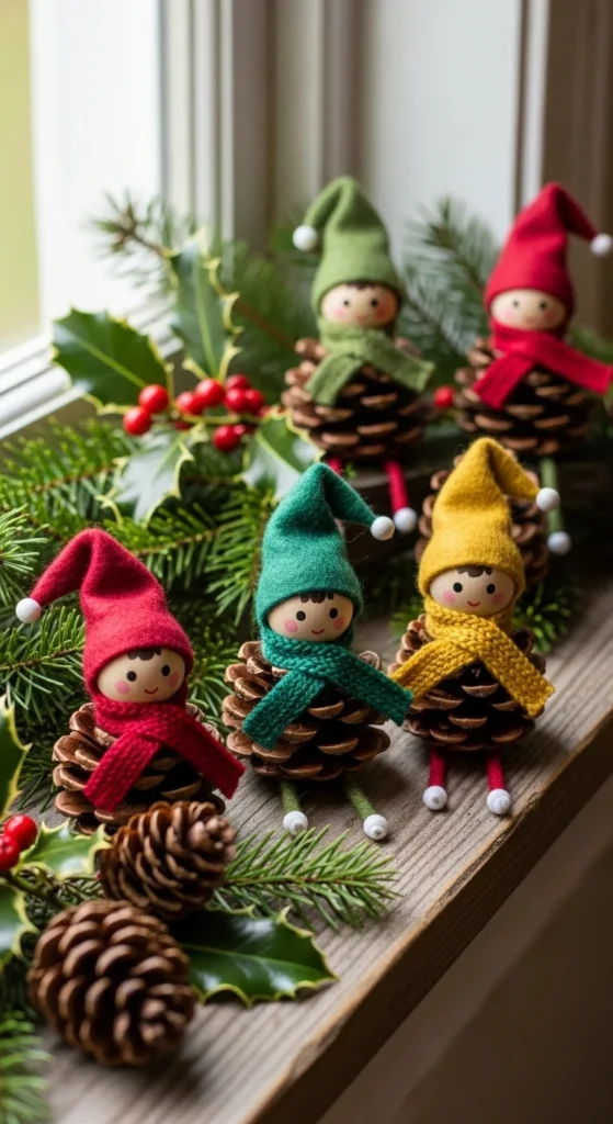 Pinecone elves combine natural materials with cheerful character. Glue a wooden bead on top of each pinecone, paint simple faces, and shape felt hats. Wrap a bit of yarn around the neck for a scarf. Kids enjoy choosing colors while adults handle the glue. These little elves look sweet on mantels, tables, or hutches. Collect pinecones from outside for a free crafting session. Keep some unpainted areas visible to retain natural charm. They’re fun to move around the house like tiny guests.