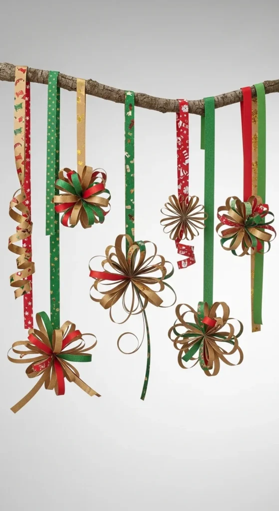Ribbon loop ornaments are quick, graceful, and extremely easy. Cut strips of ribbon, form loops, and tie the tops with twine or beads. Kids can help with choosing patterns and colors, while adults handle trimming the ends. Hang them on trees or attach them to gifts. They add gentle color and movement without overpowering the branches. Use leftover ribbon to keep the project budget-friendly. Create several sizes to give your tree a layered, handmade look.