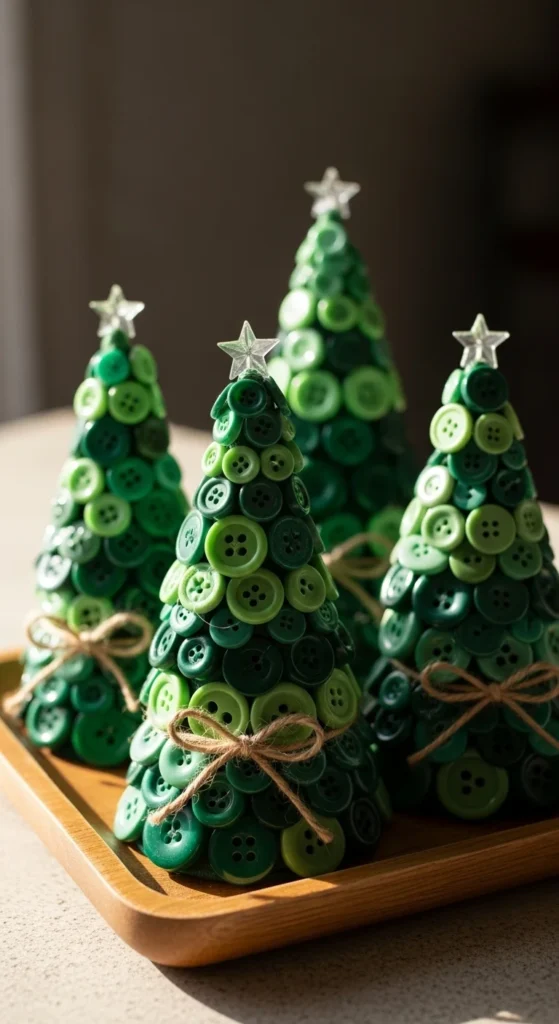 Button trees use simple materials but look charming on shelves and desks. Stack green buttons of different sizes on a pipe cleaner or wire, largest on the bottom, smallest on top. Add a star bead if you have one. Kids enjoy selecting the buttons, and adults can twist the wire. These decorations bring subtle color and can be displayed in groups. They also make sweet handmade gifts for teachers or neighbors.